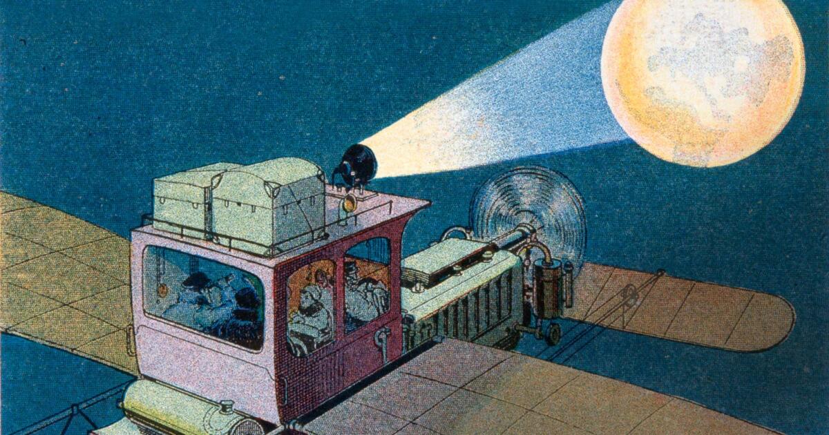 Auch im Bereich Mobilität haben viele Utopisten Weitblick bewiesen – auch wenn manche Idee in der Fantasiewelt steckenblieb: Globale Distanzen schmolzen schon damals zu Kurzstrecken, eine Schwebebahn brachte täglich Geschäftsreisende von Berlin nach Kamerun. Wer beruflich den Atlantik queren musste, nahm den unterseeischen Wal-Bus oder fuhr über Wasser und Land ohne umzusteigen mit der praktischen Schiffseisenbahn, die nahtlos von den Wellen auf die Gleise glitt. Und war die Reiselust noch nicht gestillt, ging es abends mit der geschlossenen Motorflugdroschke zum Mond und zurück (Aufmacherbild).